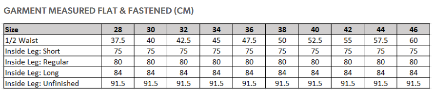 Half hem width at waist size 34" = 19cm